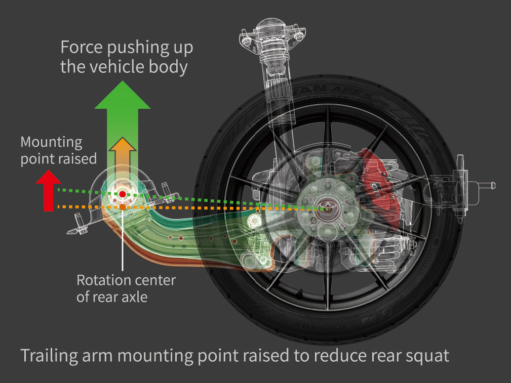 - The trailing arm mounting point, which is conventionally the center of rotation of the rear axle, has been raised to reduce rear sagging during acceleration. The resulting suppression of vehicle posture change due to accelerator operation heightens driving force response and enables stable cornering.
