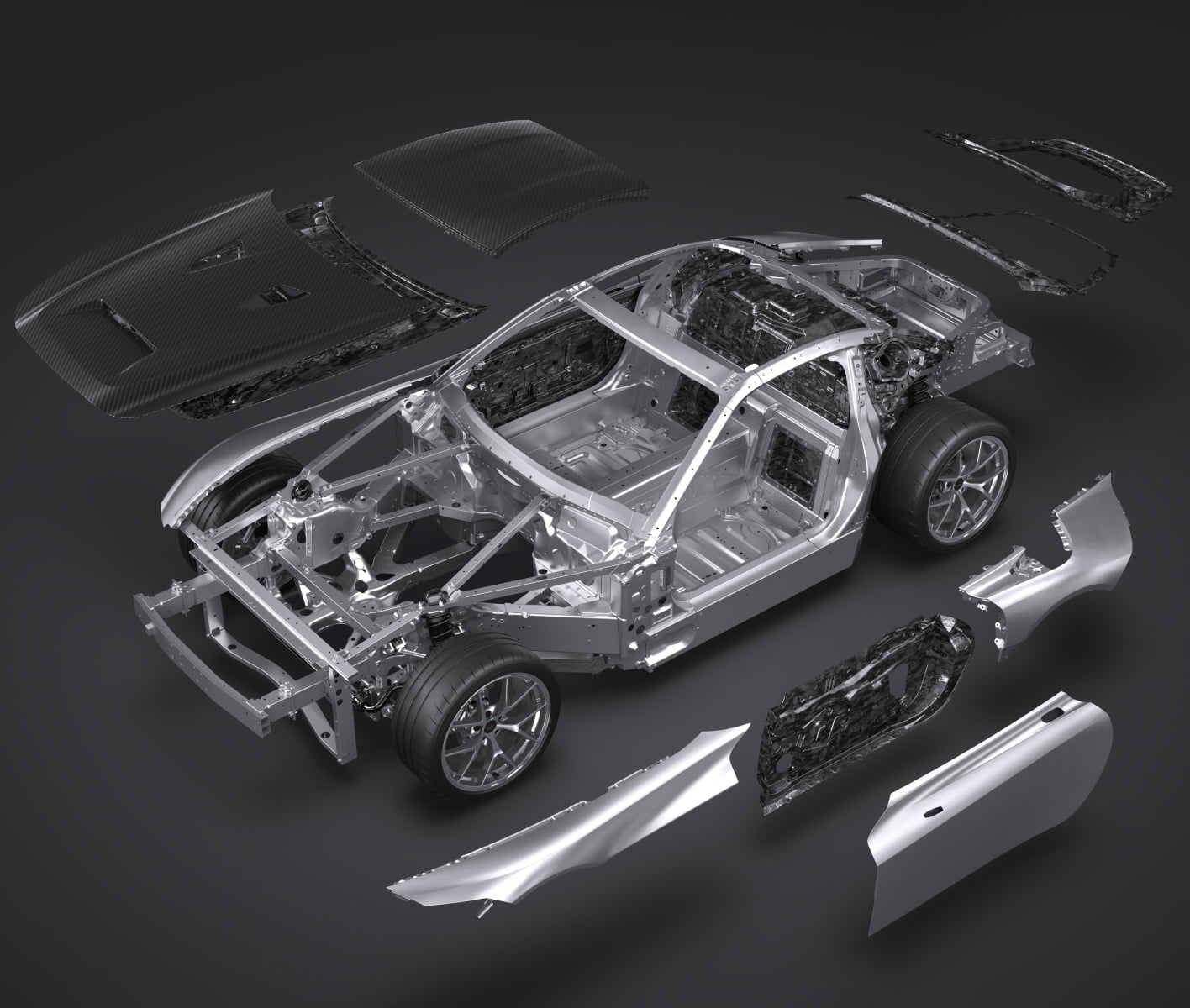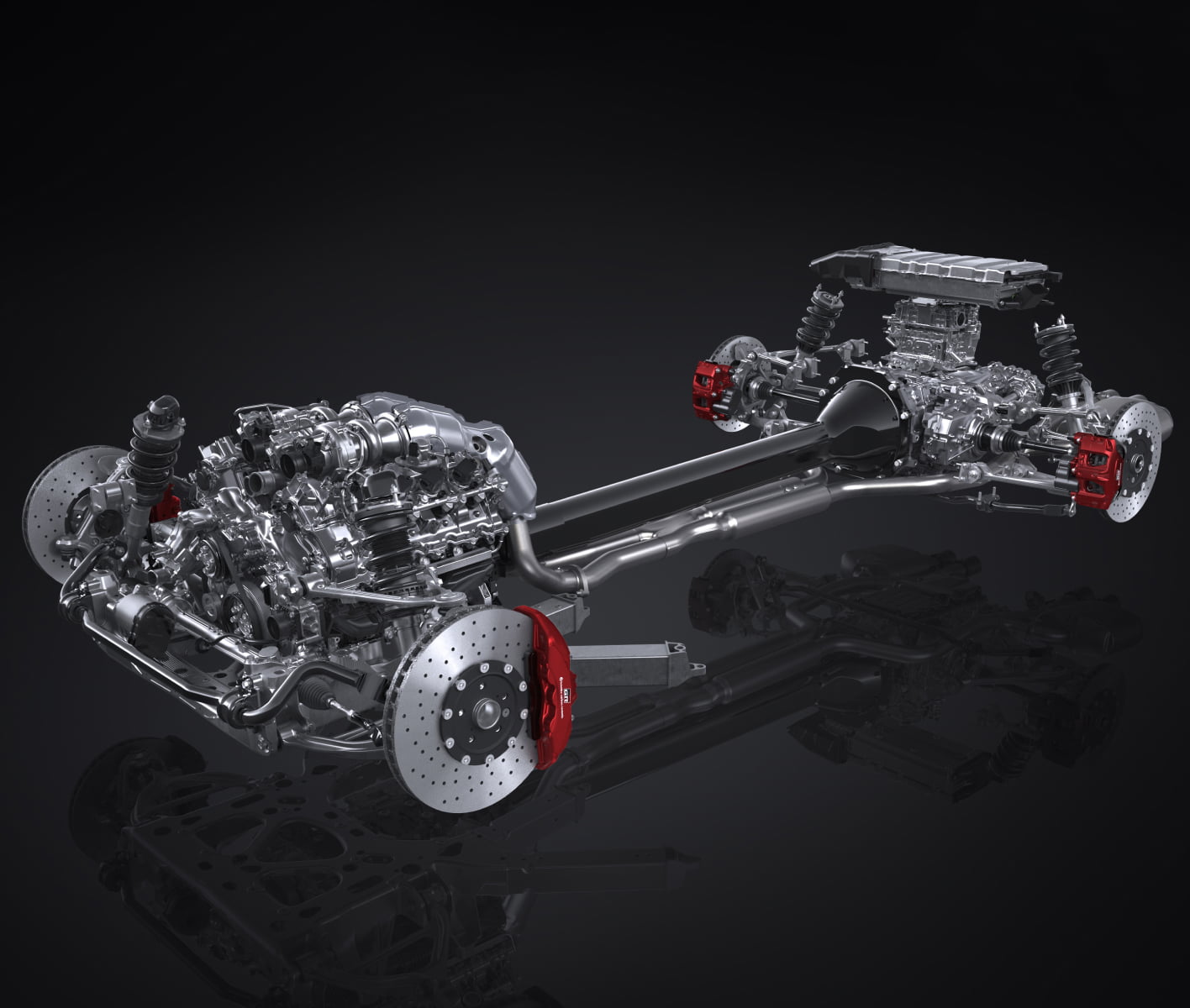 newly developed 4L V-8 twin turbo engine and single motor hybrid system target over 650PS and more than 850Nm of torque. Along with that overwhelming performance, the car is built around 3 key elements: a low center of gravity, a lightweight and high rigidity structure, and aerodynamics refined for maximum effect.
