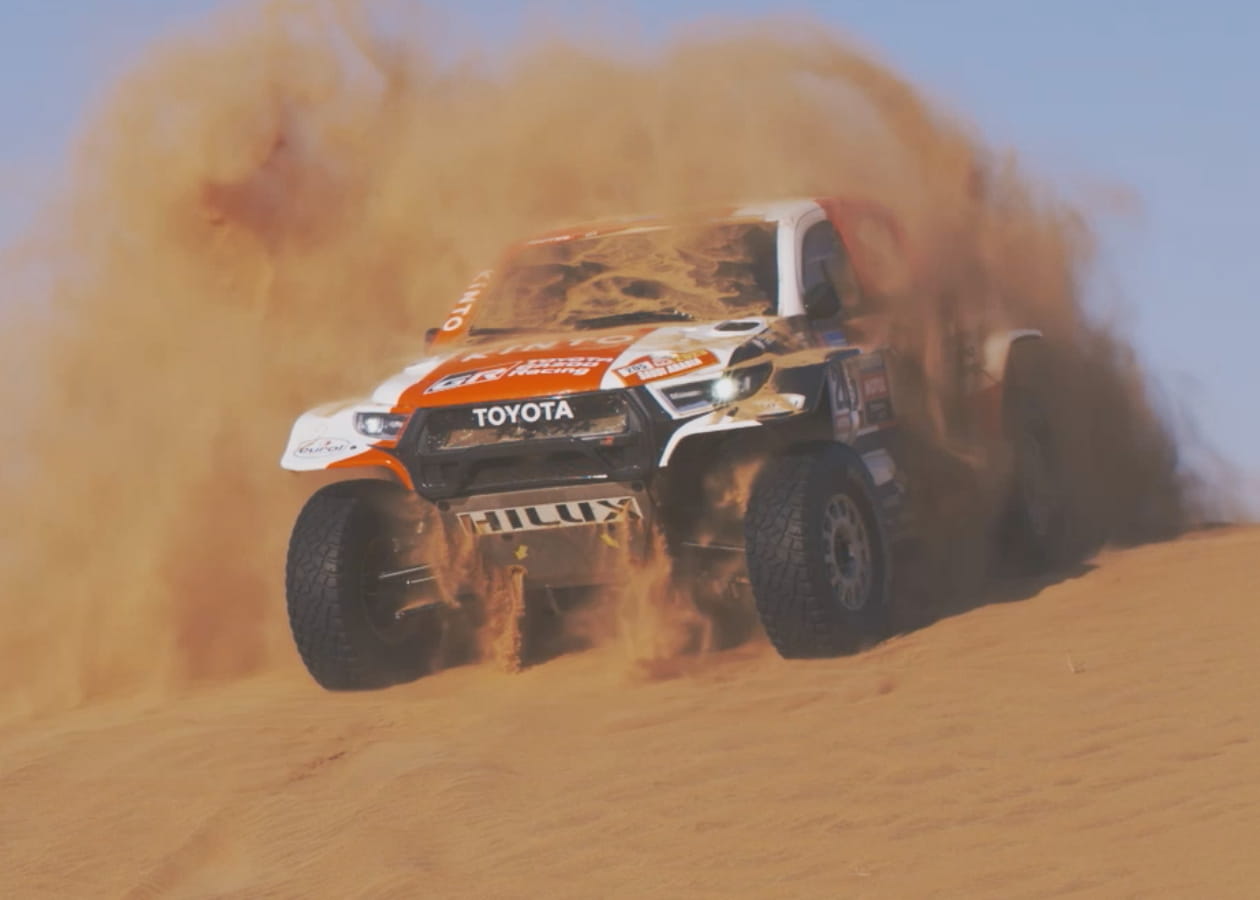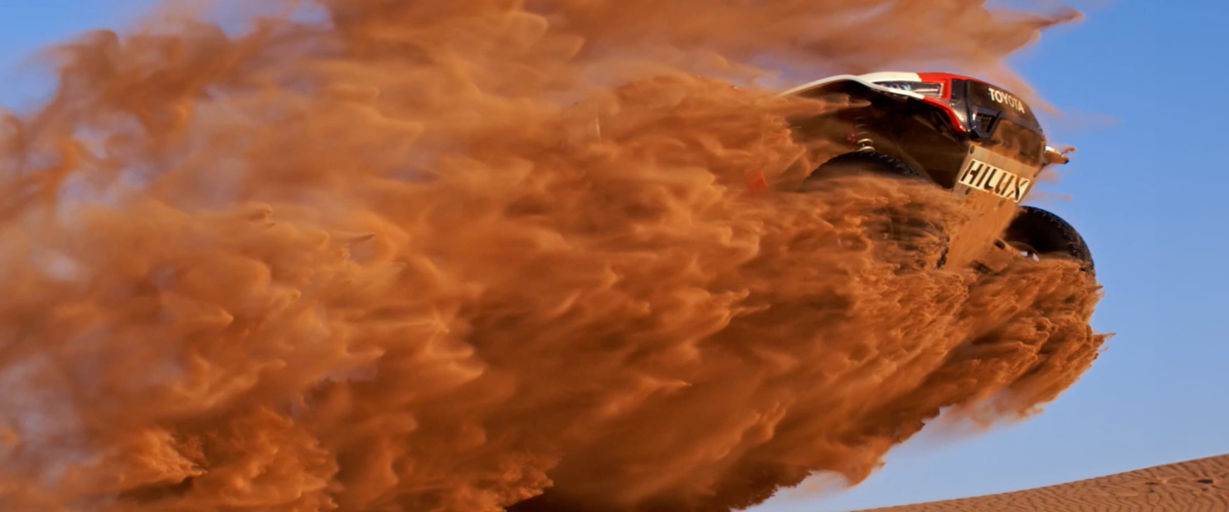 The Dakar Rally is said to be the world’s toughest rally race. Drivers compete on all types of roads, including deserts, mud, and mountains. This video captures the image of a car kicking up sand while running through a desert that resembles an ocean.