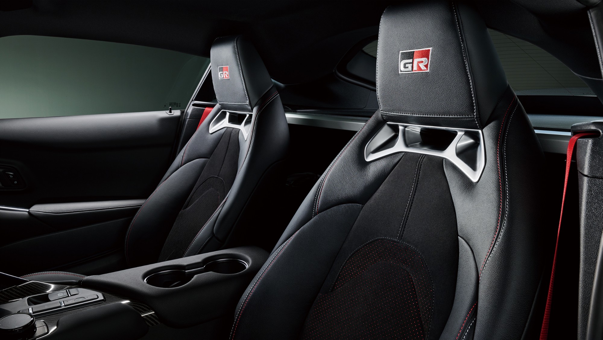 - The driver’s seat is upholstered in “GR”-embroidered Alcantara®*3 and genuine leather. A ring and the stitching on the shift knob (in six-speed, manual-transmission vehicles) and the seatbelts have been done in red to accentuate interior sportiness.