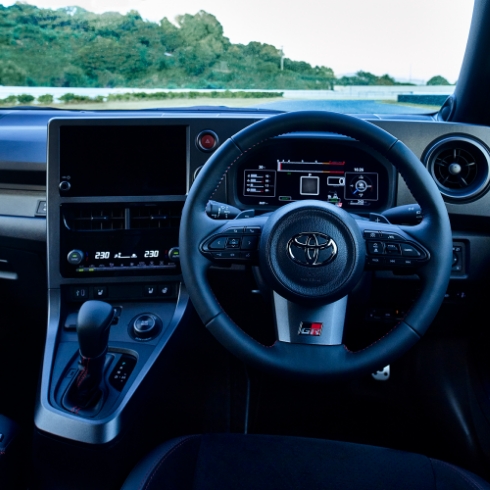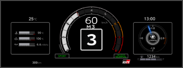 - ・ Featured new is a professional race driver-inspired 12.3-inch full-color TFT gauge display with a focus on visibility and the vehicle information necessary for sporty driving. In vehicles with the GAZOO Racing Direct Automatic Transmission, in addition to an automatic transmission oil temperature display, a visual warning has been added to the gear position display in the gauge display to augment the conventional sound-only alarm for better alerting the driver that downshifting is not possible due to overly high rpms. This change reflects requests from drivers who used a prototype vehicle in the Japanese Rally Championship and whose comments included calls for easy-to-understand warnings even during competitions in which helmets are worn.
