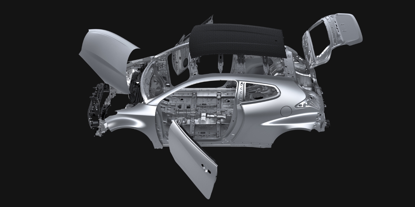 - ・ By increasing the number of spot welding points by approximately 13% and expanding the areas where structural adhesive is applied by approximately 24%, body rigidity has been increased to improve handling stability and ride comfort.