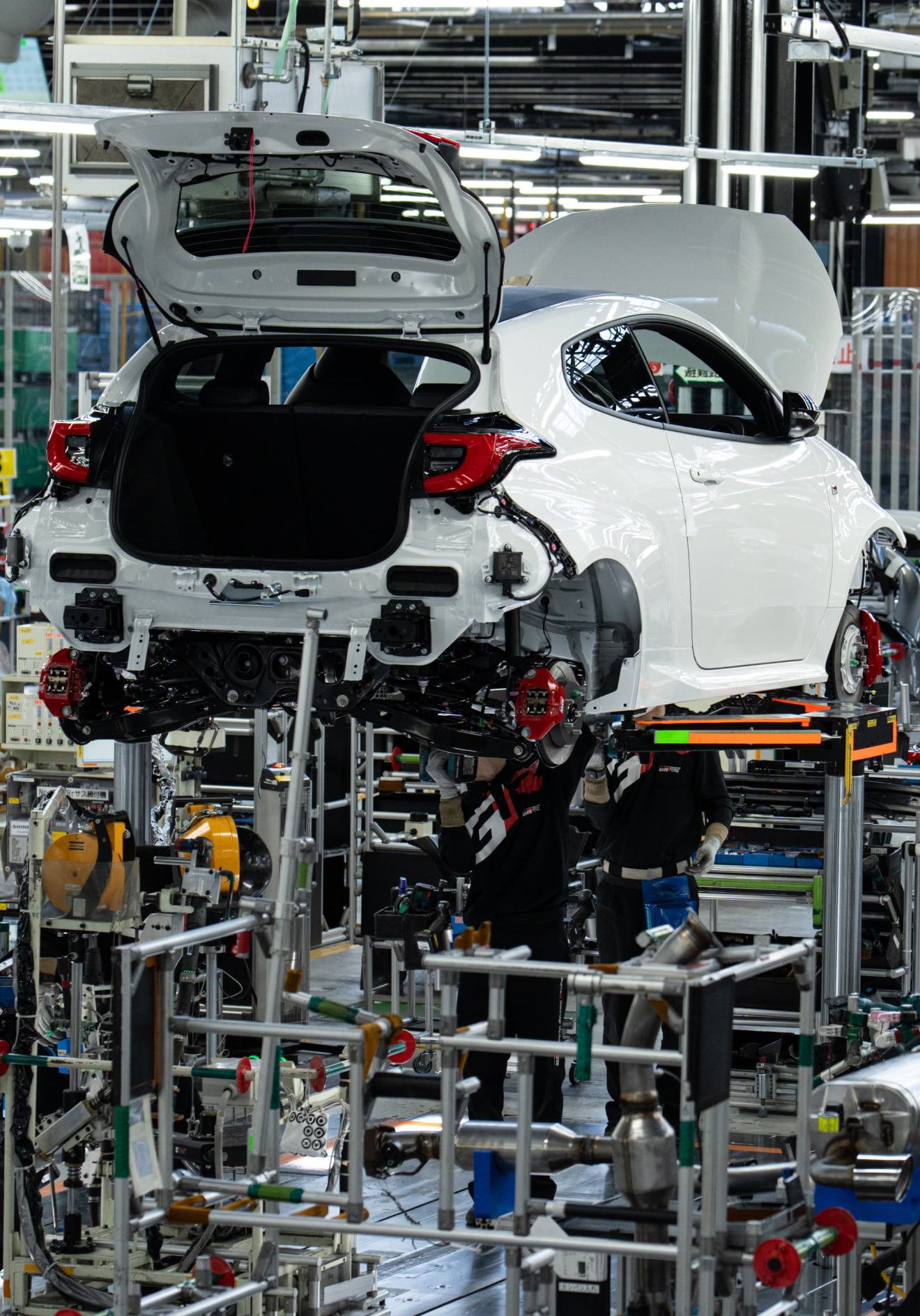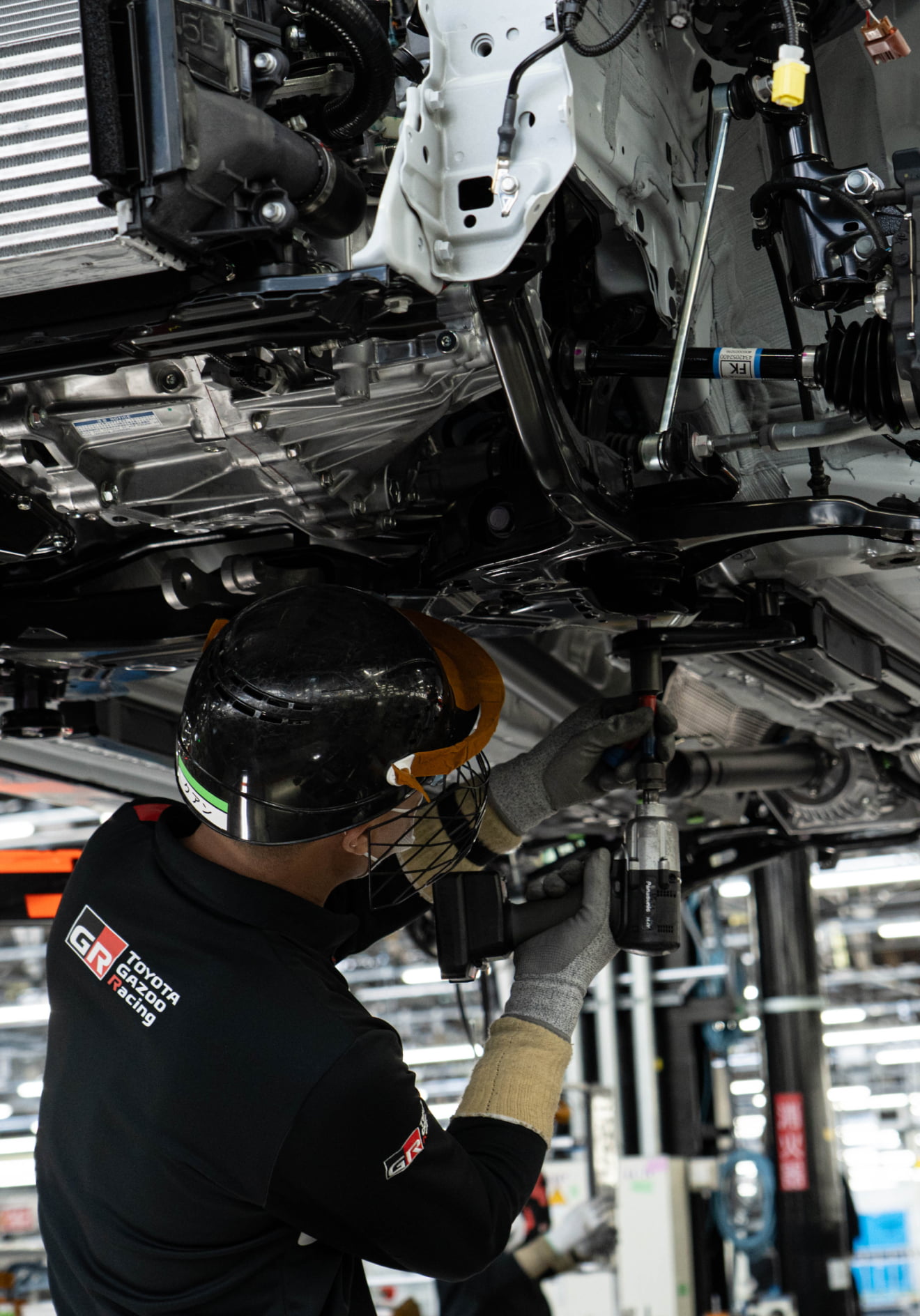 GR FACTORYで製造されるクルマは、レーシングカー並みの剛性を備えている。一般的なクルマよりも多数の溶接と、多量の構造用接着剤が塗布されて作られるからだ。これらはWRC (FIA世界ラリー選手権) などのモータースポーツからのフィードバックに基づいている。