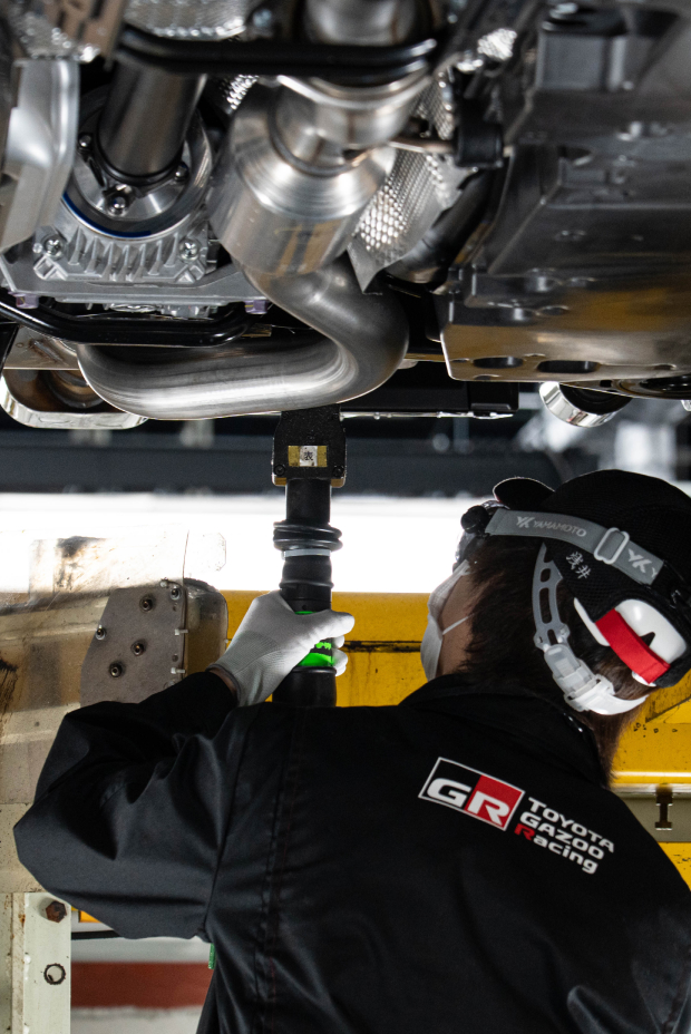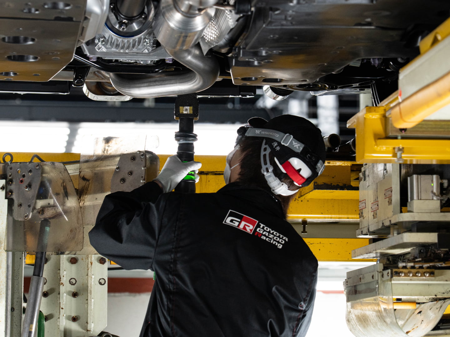 その後の取り付けは、内外装部品を装着したボディを、上から足回りに降ろして搭載する方法を採用した。適切な荷重がかかった状態で足回りの組付けを実施する。モータースポーツの現場で1台のレーシングカーを丁寧に製作する際に使われている手法を、GR FACTORYで量産車の生産においても実現した。