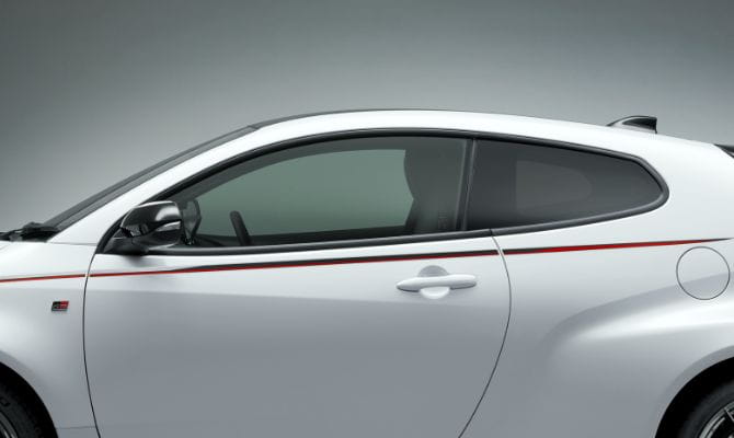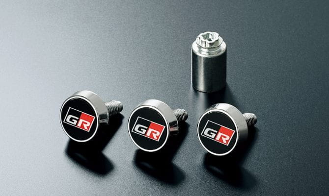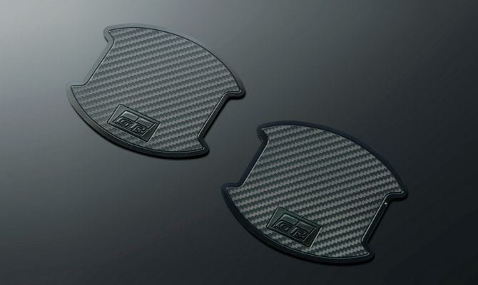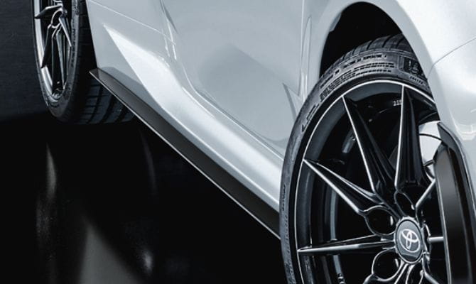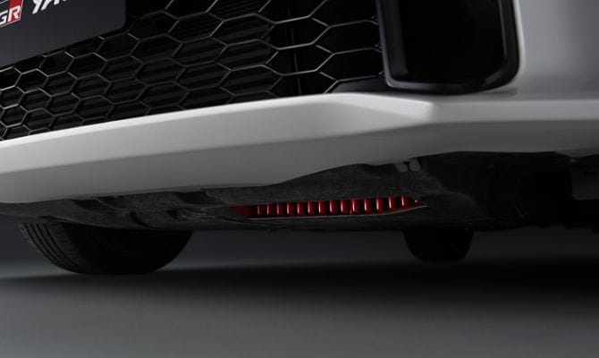 GRエアロパーツセット、GRボディストライプ、GRカーボンナンバーフレーム、GRディスチャージテープ(GRロゴ入りアルミテープ)を装着しています。